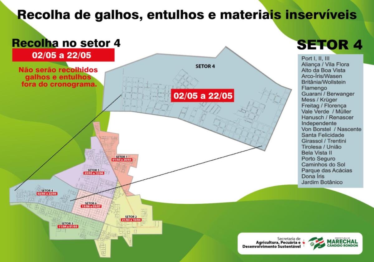 Equipe da Secretaria de Agricultura, Pecuária e Desenvolvimento Sustentável de Marechal Cândido Rondon atua na recolha de galhos, entulhos e materiais inservíveis no setor quatro. A recolha nessa região acontecerá até o dia 22 de maio.