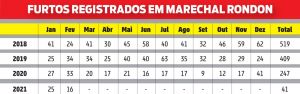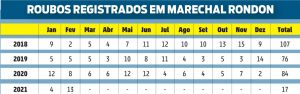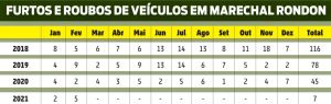 Tratando-se apenas de roubos e furtos de veículos em Marechal Rondon, a PM registrou sete ocorrências no primeiro bimestre de 2021, uma a mais que o mesmo período em 2020. Se comparado com os dois primeiros meses de 2018 e 2019 (13 registros em ambos os períodos), por outro lado, o primeiro bimestre deste ano registrou uma diminuição de 46%.