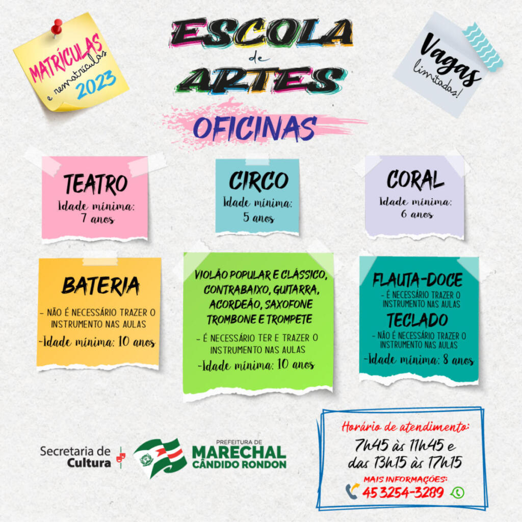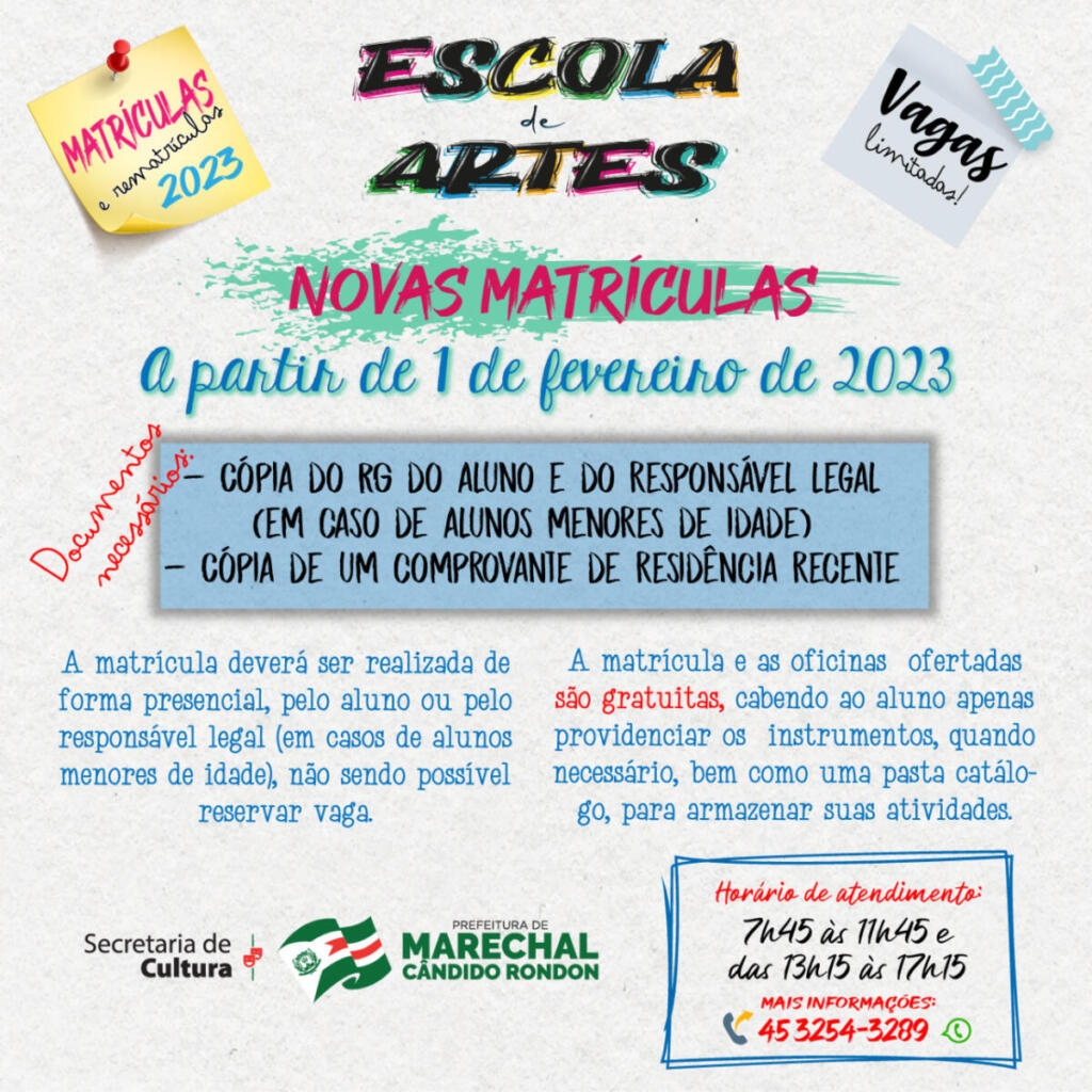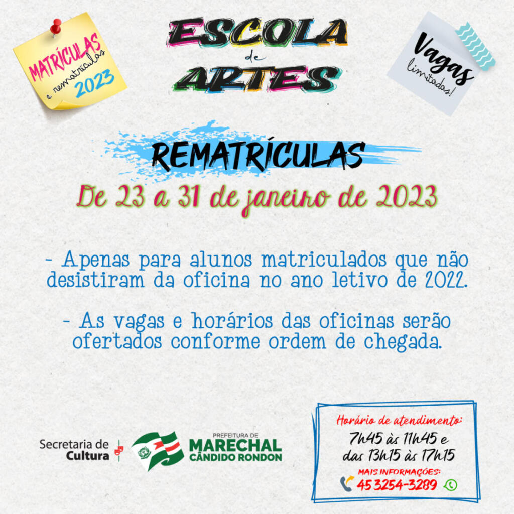 A Secretaria de Cultura de Marechal Cândido Rondon informa que as rematrículas das atividades culturais da Escola de Artes para alunos não desistentes ocorrerão no período de 23 a 31 de janeiro.
