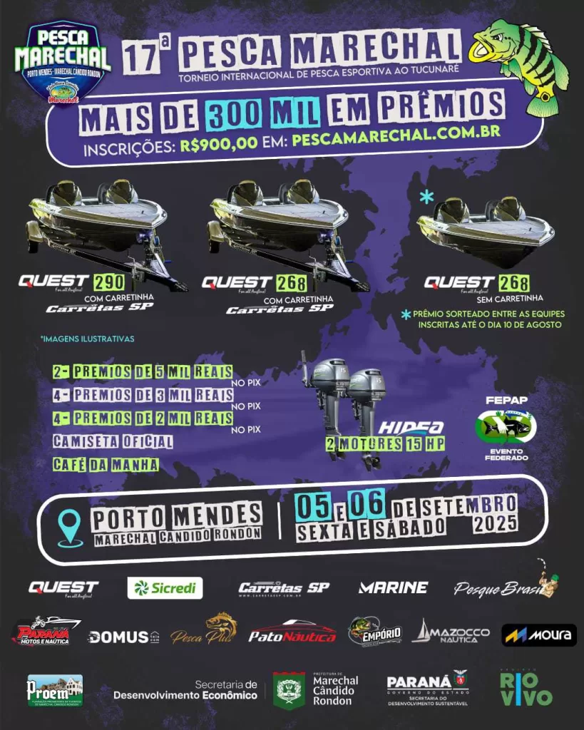 O evento acontecerá nos dias 5 e 6 de setembro, no distrito turístico de Porto Mendes, em Marechal Cândido Rondon, com realização do Clube de Pesca Esportiva Marechal e apoio da prefeitura, através da Secretaria de Desenvolvimento Econômico, da Proem, do Governo do Paraná e do Projeto Rio Vivo.