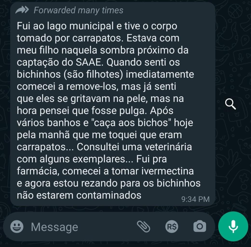 Amplamente compartilhada, o texto menciona um “ataque” de carrapatos em uma pessoa no Lago Municipal. Conforme os relatos, o indivíduo removeu os animais tão logo os percebeu, mas teria sentido que “eles se gritavam na pele”.