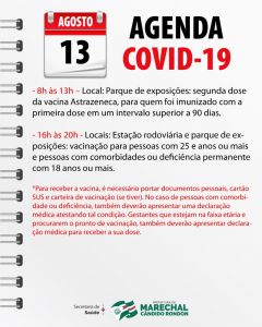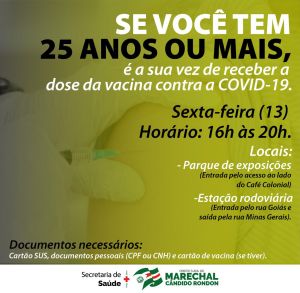 Rondonenses de 25 anos ou mais chegaram à vez de se imunizar contra a Covid-19. A vacinação acontece nesta sexta-feira (13), das 16 às 20 horas, na estação rodoviária e no parque de exposições. A Secretaria de Saúde informa que as doses são limitadas para esse dia.