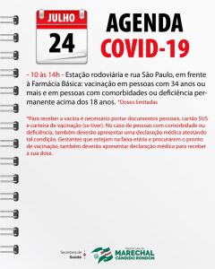 O cronograma de vacinação contra a Covid-19 terá sequência neste sábado (24), em Marechal Cândido Rondon. Desta vez, serão imunizadas as pessoas com 34 anos ou mais e pessoas com comorbidades ou deficiência permanente com 18 anos ou mais.