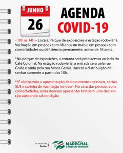 A Secretaria de Saúde de Marechal Cândido Rondon dará sequência neste sábado, dia 26, à vacinação contra a Covid-19 para pessoas com 48 anos ou mais, primeira dose. Também serão imunizadas pessoas com comorbidades ou deficiência permanente, acima de 18 anos, também primeira dose, que ainda não foram vacinadas. Haverá 750 doses disponíveis.