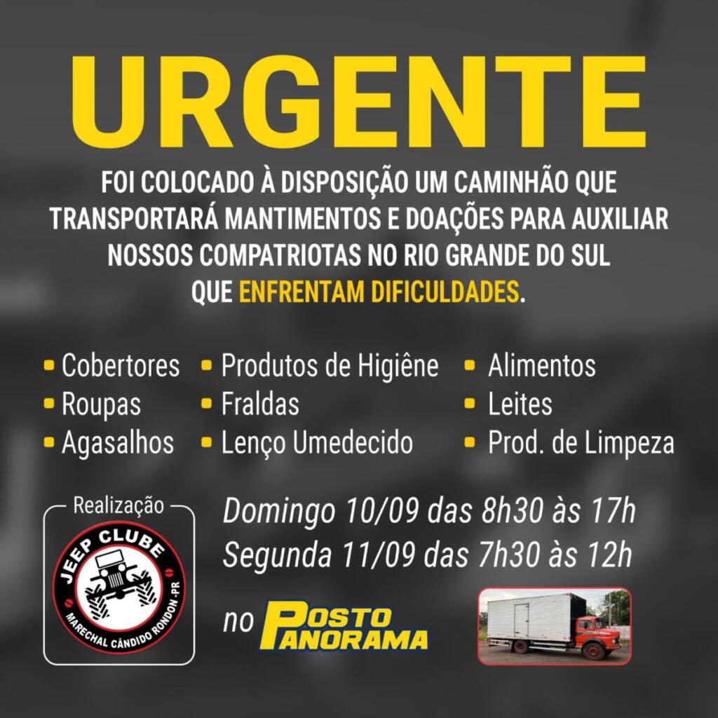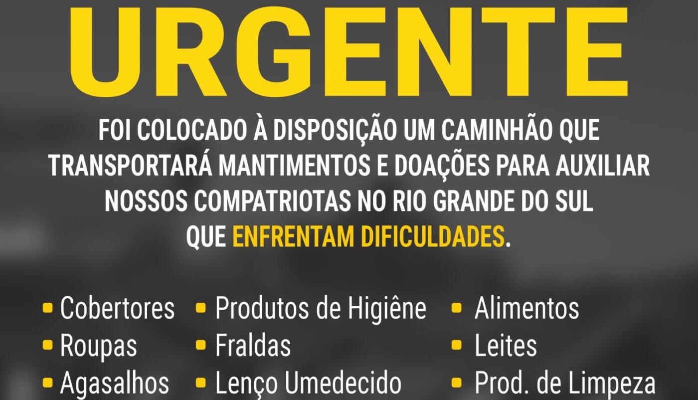 Foi colocado à disposição, no Posto Panorama, na Avenida Rio Grande do Sul, 450, no centro da cidade, um caminhão que transportará mantimentos e doações para auxiliar as famílias atingidas pelos desastres naturais no Rio Grande do Sul.
