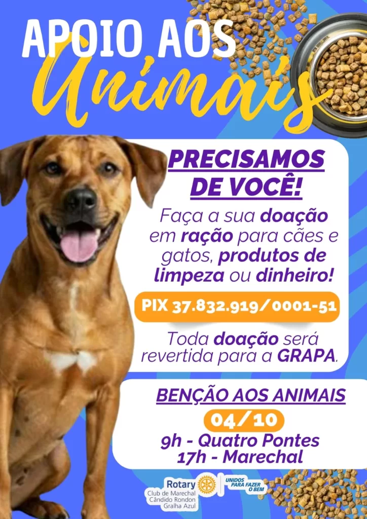 Em comemoração ao Dia de São Francisco de Assis, celebrado em 4 de outubro, o Rotary Club de Marechal Cândido Rondon Gralha Azul realiza uma campanha de arrecadação de ração e produtos de limpeza destinados à GRAPA (Grupo Regional de Amigos e Protetores dos Animais).
