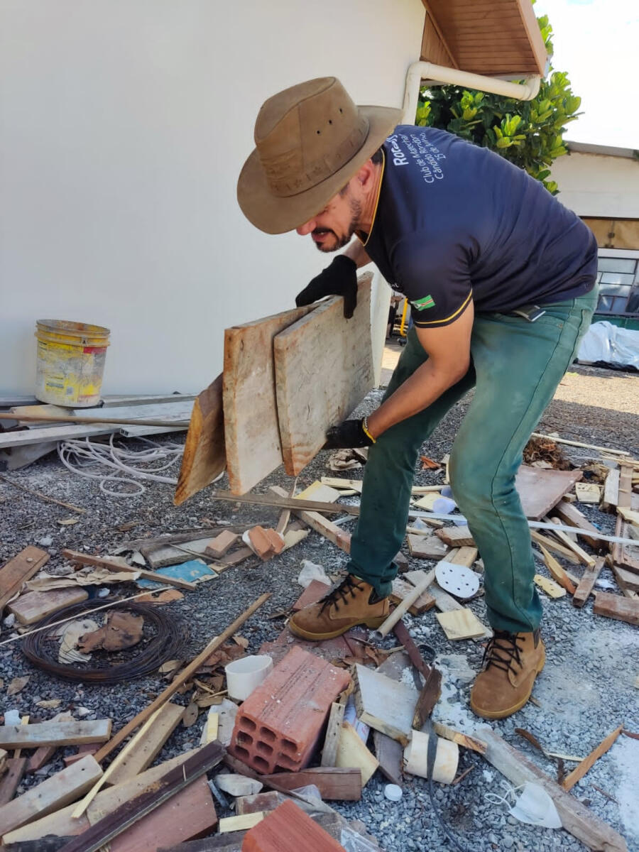 Os voluntários foram recebidos pela atual presidente do Asilo, Mirta Steinmacher, que também é rotariana, com um café da manhã e, em seguida, foram divididos em equipes de trabalhos, para realizarem tarefas de melhoramento no entorno do local, como a recolha de entulhos e limpeza dos canteiros.