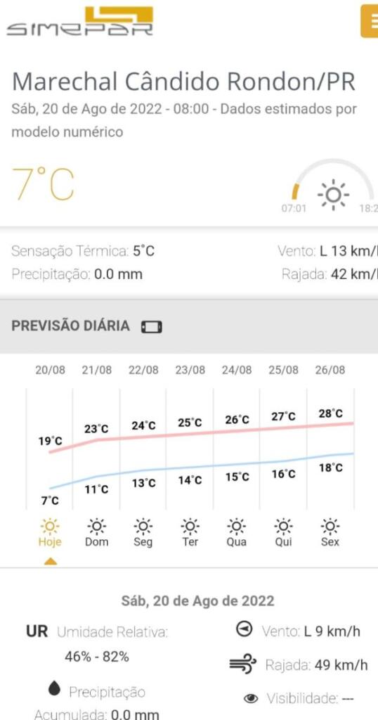 A máxima hoje não deve passar dos 19°C. Segundo o Simepar, as rajadas de ventos podem passar dos 49 Km/h.