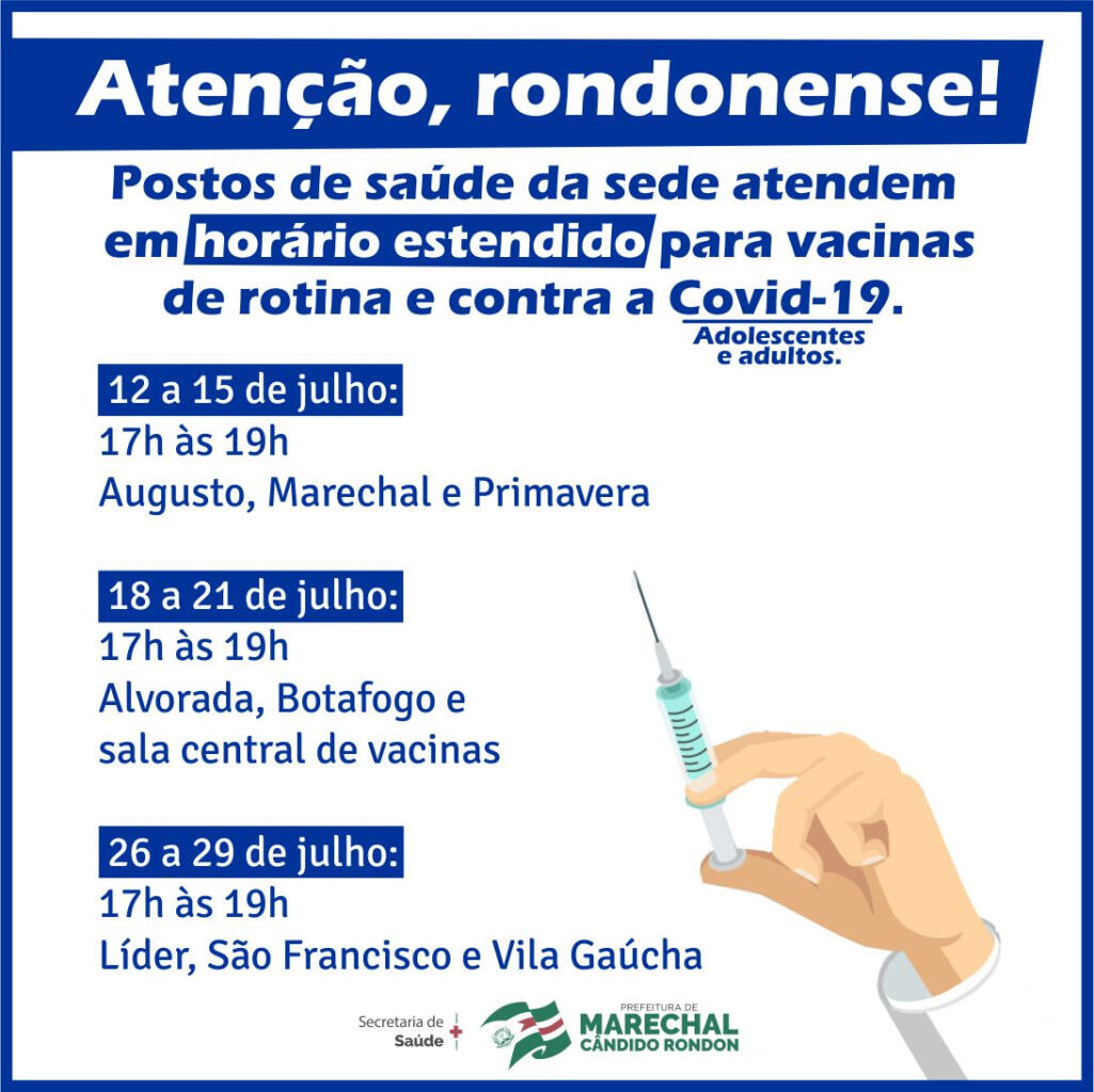 Com a necessidade de ampliar a cobertura vacinal da comunidade em geral, a Secretaria de Saúde de Marechal Cândido Rondon informa que a partir desta terça-feira (12) as salas de vacina da sede municipal passam a atender em horário estendido e de forma escalonada.