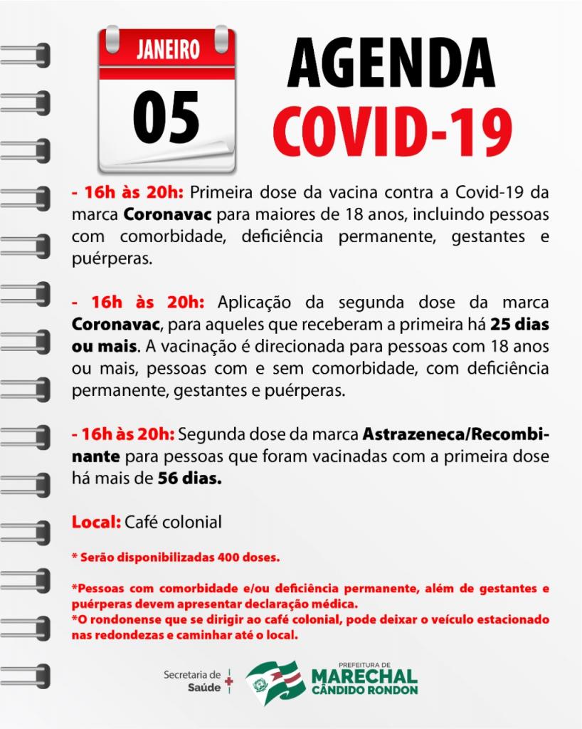 Nesta quarta-feira (05), a Secretaria de Saúde de Marechal Cândido Rondon disponibiliza vacinas da primeira dose e segunda dose dos imunizantes Coronavac e Astrazeneca.