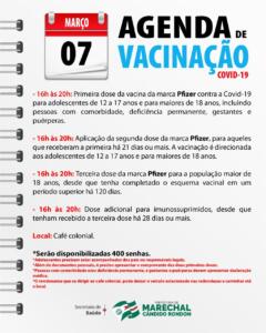 A Secretaria de Saúde de Marechal Cândido Rondon divulgou na tarde deste domingo (06) a agenda de vacinação contra a Covid de segunda-feira (07).