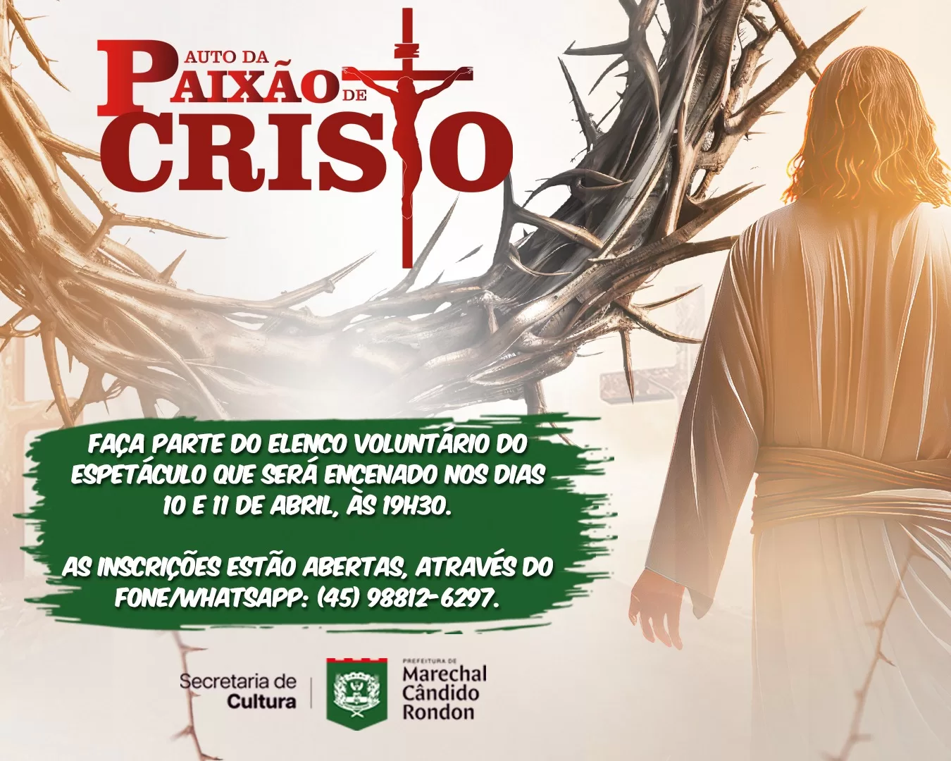 A prefeitura de Marechal Cândido Rondon, por meio da Secretaria de Cultura, convida a comunidade a participar do elenco voluntário do grande espetáculo “Auto da Paixão de Cristo”, que será encenado nos dias 10 e 11 de abril, às 19h30, na arena de rodeios do parque de exposições.