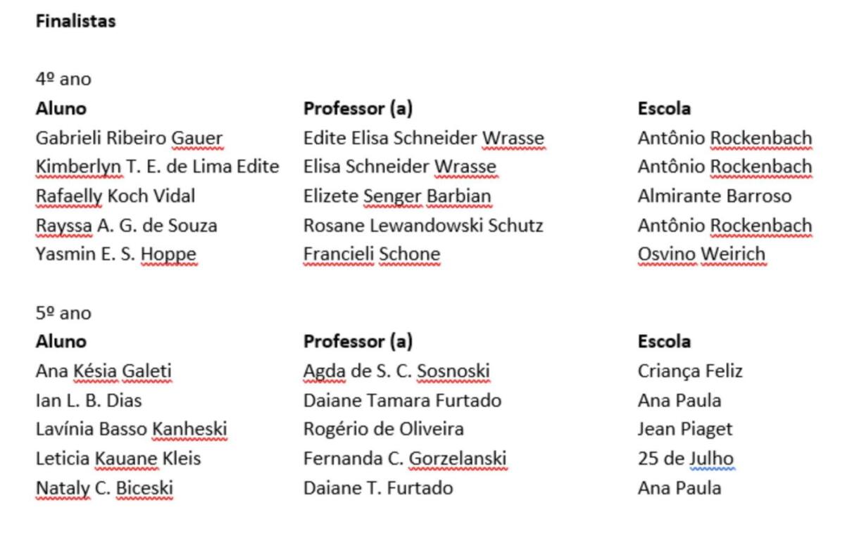 A Secretaria de Educação de Marechal Cândido Rondon divulgou os nomes dos finalistas do 1º Concurso de Redação, promovido pela prefeitura, com alunos dos 4ºs e 5ºs anos das escolas municipais. As redações foram produzidas com o apoio dos professores, sendo selecionados cinco alunos de cada ano. A premiação será entregue no dia 1º de dezembro, em evento a ser realizado no auditório da prefeitura, às 19h.