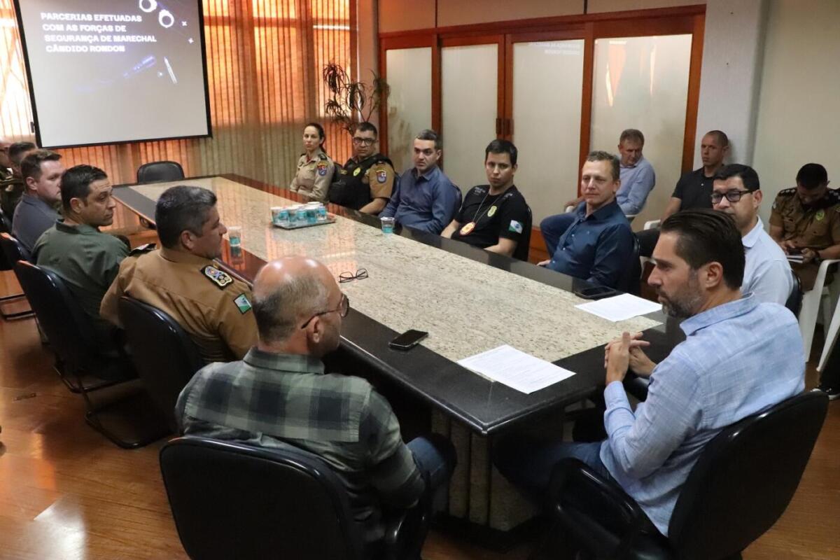 O secretário estadual de Segurança Pública, coronel Hudson Leôncio Teixeira, e o comandante-geral da Polícia Militar (PM) no Paraná, coronel, Jefferson Silva, estiveram reunidos na manhã desta quinta-feira (03) na Prefeitura de Marechal Cândido Rondon, onde foram recepcionados pelo prefeito Marcio Rauber.