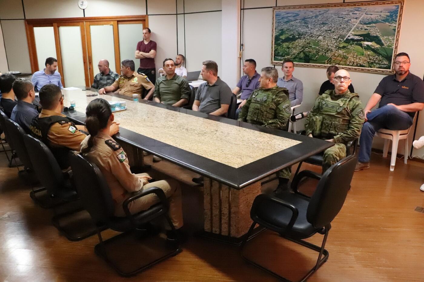 Estiveram presentes à reunião no paço municipal o prefeito Marcio Rauber, o secretário municipal de Mobilidade, coronel Welyngton Alves da Rosa, o presidente da Câmara Municipal, vereador Soldado Sauer, vereadores Carlinhos Silva, Cristiano Metzner (Suko), Juliano Oliveira, Rafael Heinrich e Sargento Dionir, a comandante do Corpo de Bombeiros, capitã Marcela Schwendler, o comandante da 2ª Companhia da PM, capitão Daniel Zambon, o comandante do Batalhão de Polícia de Fronteira (BPFron), major Sérgio Nabozny, o delegado Julio Krueger, o major Tiago Zajac, do Comando Regional do Corpo de Bombeiros, e o coordenador estadual da Operação Hórus, coronel Saulo Sanson.