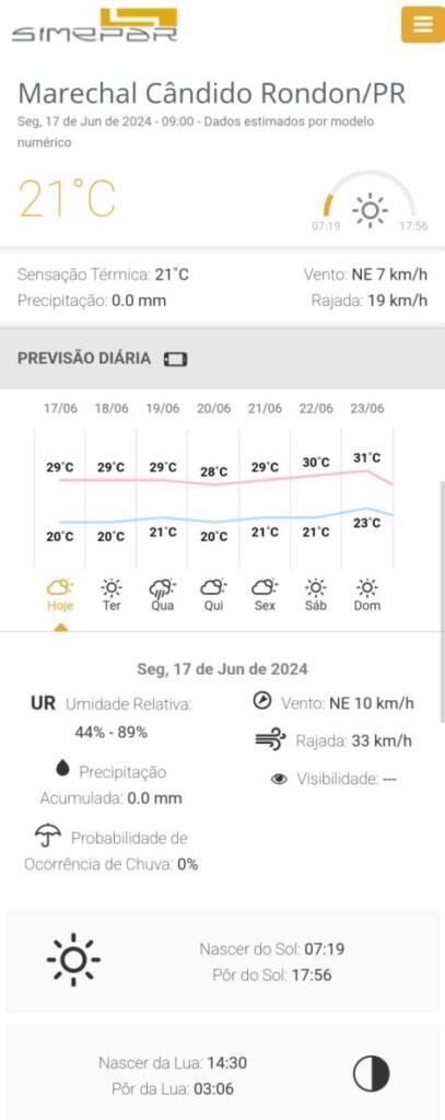 Confira a previsão para Marechal Rondon nos próximos dias, segundo o Simepar: