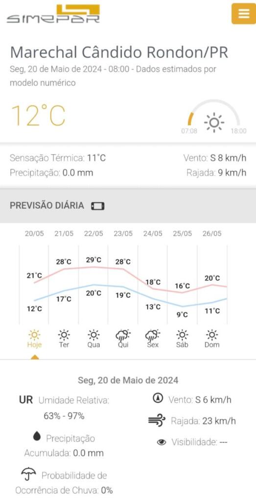 Em Marechal Cândido Rondon a segunda-feira começou fria e com nebulosidade. Os termômetros marcavam 11ºC no início da manhã. A máxima prevista para hoje é de 21ºC. Não há previsão de chuva para os próximos dias, de acordo com o Simepar.