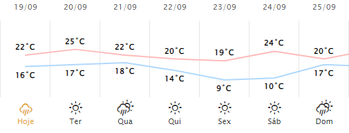 A temperatura máxima prevista para hoje no município é de 22ºC. A umidade relativa do ar varia entre 59% e 96% e as rajadas de vento devem chegar a 57 Km/h, segundo o Simepar.