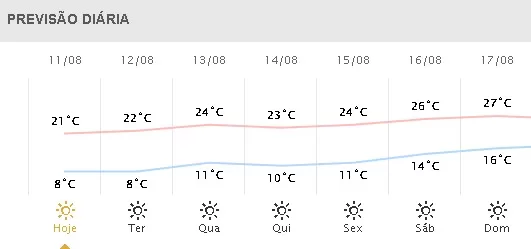 A previsão para Toledo é de sol brilhando forte, termômetros variado de 7°C a 19°C, ventos de até 17km/h e umidade do r entre 40% e 83%.
