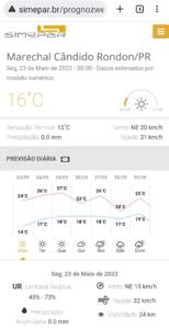 Em Marechal Cândido Rondon, as temperaturas mínimas e máximas variam de 17ºC a 27ºC, respectivamente, de acordo com o Simepar. A previsão é de céu claro até quarta-feira (25), tempo nublado na quinta (26), pancadas de chuva na sexta (27) e chuva no sábado (28).