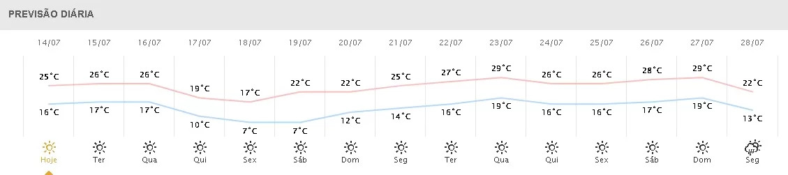 Em Toledo, as temperaturas ficam entre 15°C e 23°C. Já em Foz do Iguaçu, o calor aparece um pouco mais: mínima de 15°C e máxima de 25°C. O tempo seco favorece atividades ao ar livre em toda a região.