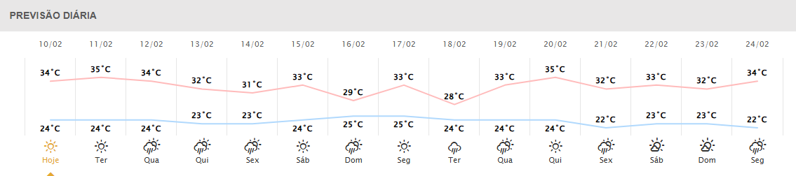 Foz do Iguaçu terá dia quente com máxima de 34°C, ventos de até 43km/h e umidade do ar entre 41% e 90%.