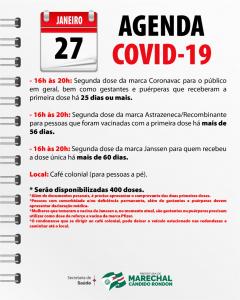 A vacinação contra a Covid-19 tem sequência nesta quinta-feira (27) em Marechal Cândido Rondon. Conforme a agenda divulgada pela Secretaria de Saúde, há 400 doses de imunizantes disponíveis nesta tarde, das 16 às 20 horas, no Café Colonial.