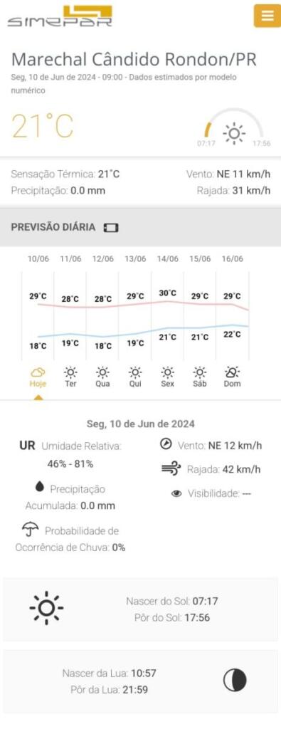 Confira a previsão para os próximos dias em Marechal Rondon, conforme o Simepar: