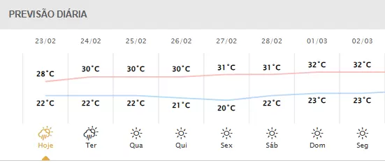 Foz do Iguaçu com previsão de tempo estável, ventos de 40km/h, mínima de 23°C e máxima de 28°C.