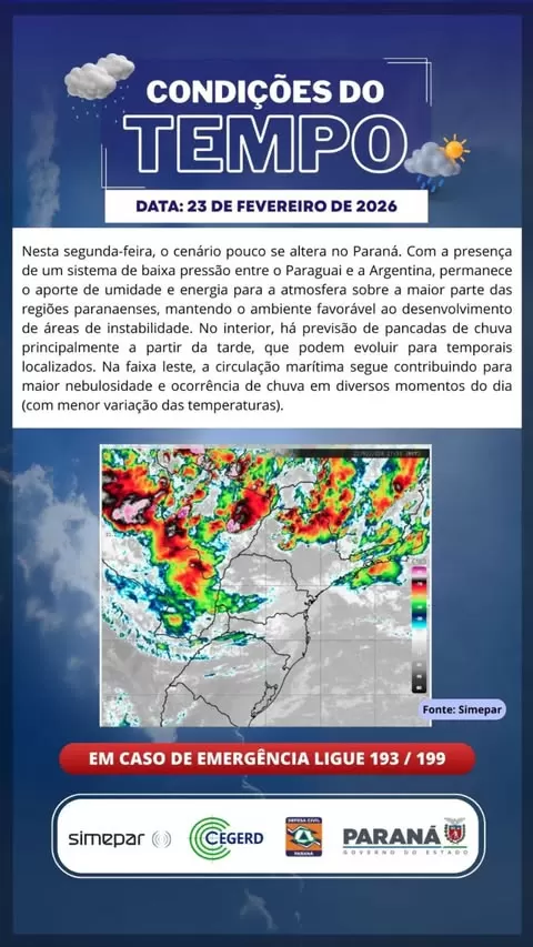 Segundo o Sistema de Tecnologia e Monitoramento Ambiental do Paraná (Simepar), nesta segunda-feira, o cenário pouco se altera no Paraná. Com a presença de um sistema de baixa pressão entre o Paraguai e a Argentina, permanece o aporte de umidade e energia para a atmosfera sobre a maior parte das regiões paranaenses, mantendo o ambiente favorável ao desenvolvimento de áreas de instabilidade.