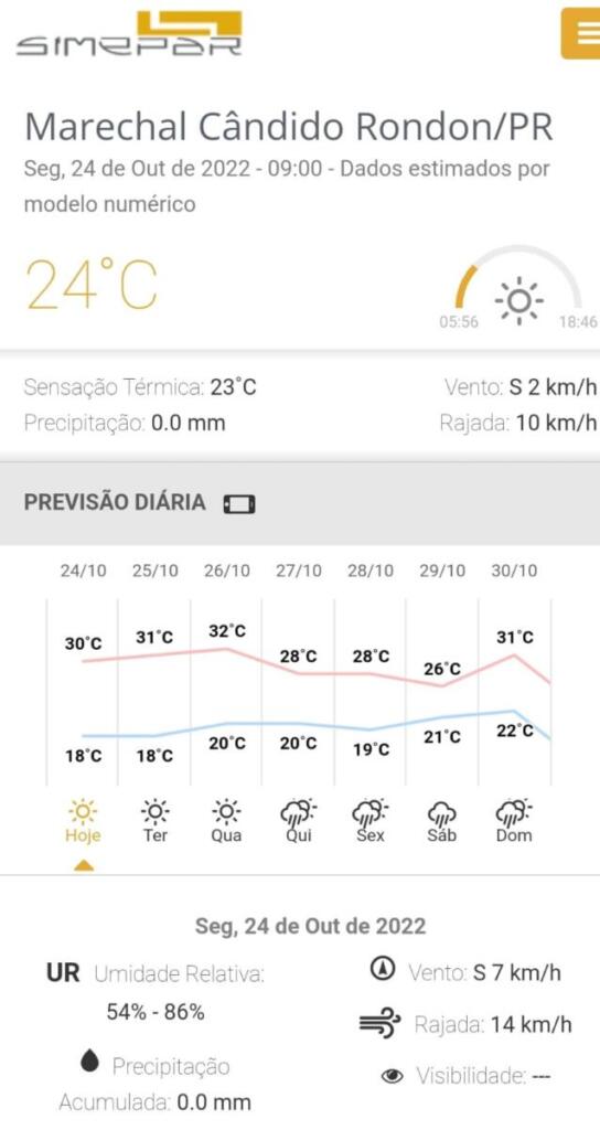 Veja a previsão para esta semana para Marechal Rondon, segundo o Simepar: