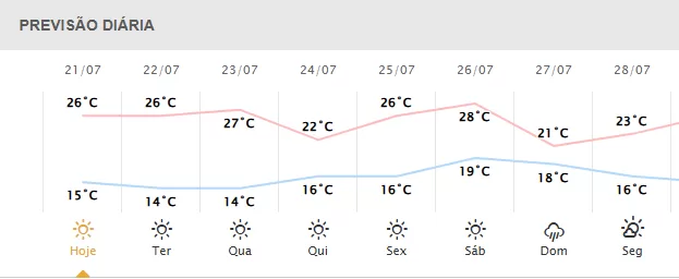 Mínima: 14°C a 19°C | Máxima: 21°C a 28°C | Chuva: leve e isolada no domingo