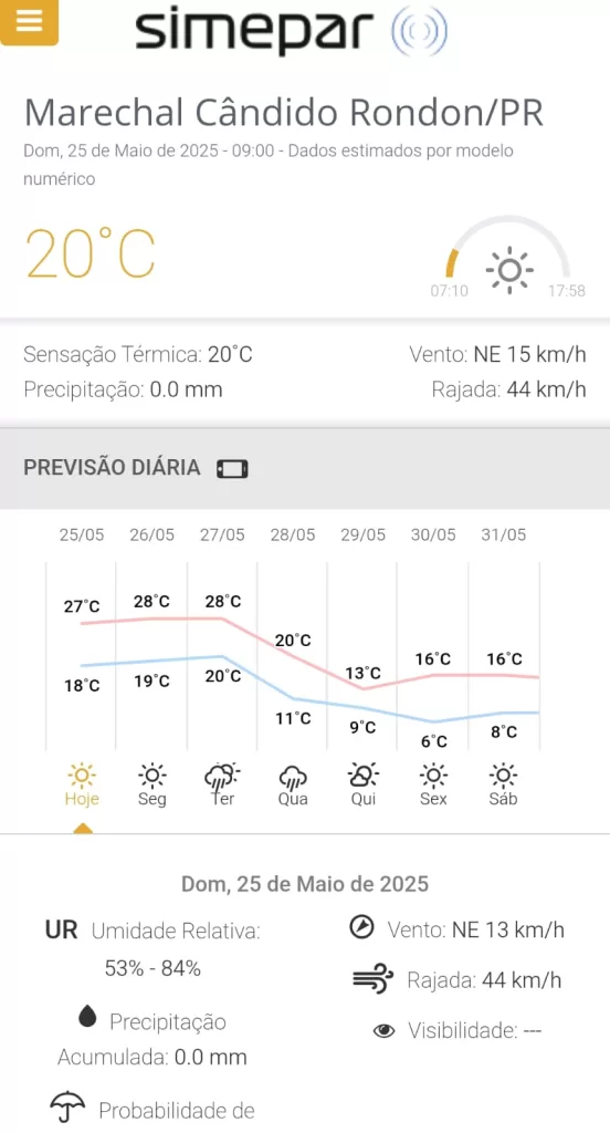 Veja abaixo a previsão do tempo para Marechal Rondon nos próximos dias.