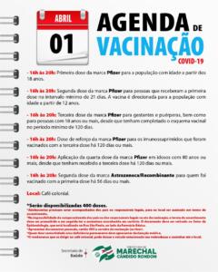 A Secretaria de Saúde começa o mês dando sequência ao cronograma de vacinação contra a Covid-19 em Marechal Cândido Rondon. Nesta sexta-feira (1º), a aplicação das vacinas acontece das 16 às 20 horas no Café Colonial, com 400 doses disponíveis.