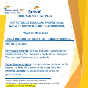 O Serviço Nacional de Aprendizagem Comercial (Senac) de Marechal Cândido Rondon tem uma vaga disponível para instrutor de Educação Profissional na área de hospitalidade e gastronomia.