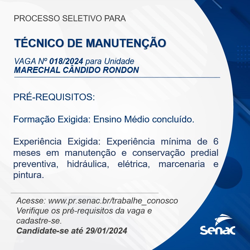 A Unidade Senac de Marechal Cândido Rondon está com vaga aberta para técnico de Manutenção. As inscrições estão abertas até o dia 29 de janeiro.