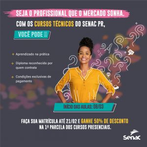 As aulas dos cursos técnicos terão início em 08 de março de 2022 em 31 unidades do Senac no Paraná. Os cursos ofertados em Marechal Cândido Rondon são: Técnico em Enfermagem, Técnico em Radiologia e Técnico em Informática para Internet.