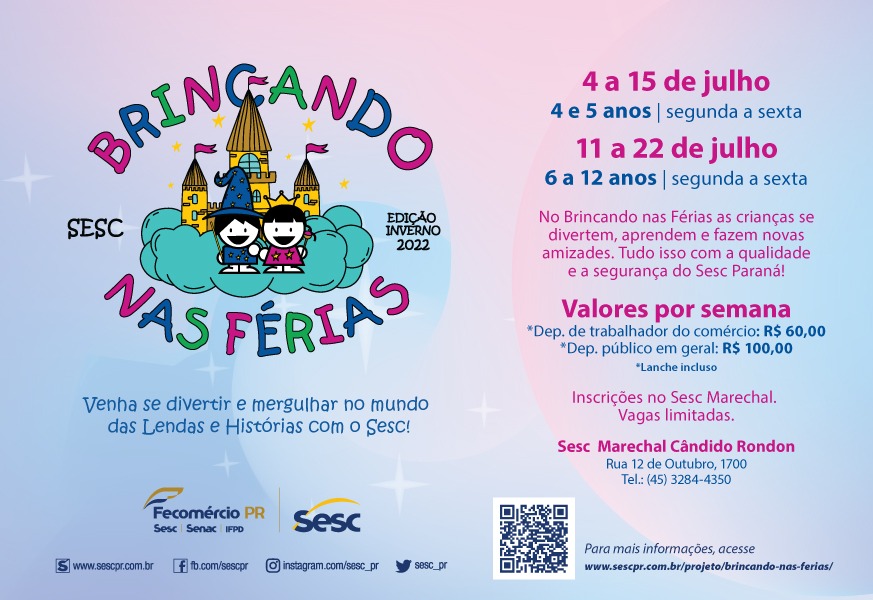 O Serviço Social do Comércio (Sesc) de Marechal Cândido Rondon está com vagas abertas para o Brincando nas Férias, programa que é garantia de diversão e alegria para a criançada.