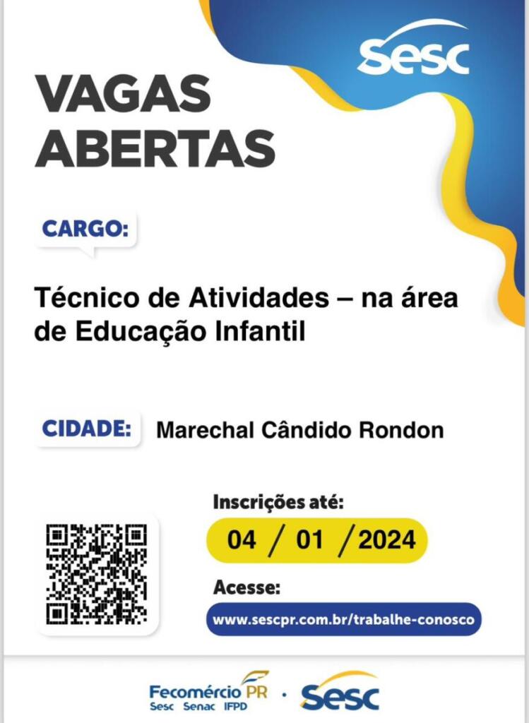 O Serviço Social do Comércio (Sesc) está com vagas abertas na unidade de Marechal Cândido Rondon. Aos interessados, as oportunidades são para o cargo Técnico de Atividades na área de Educação Infantil.