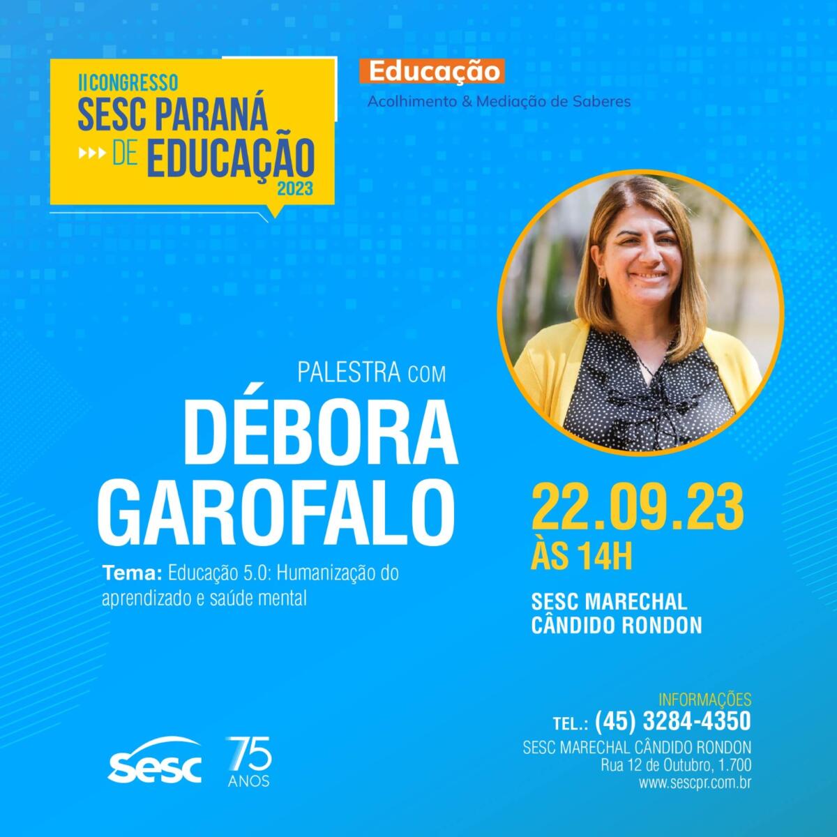 O Serviço Social do Comércio (Sesc) de Marechal Cândido Rondon realiza, na próxima semana, uma palestra com Débora Garofalo sobre o tema “Educação 5.0: Humanização do aprendizado e saúde mental”.