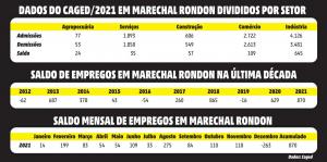 Segundo o Cadastro Geral de Empregados e Desempregados (Caged), o saldo de empregos obtido no último ano foi o segundo maior dos últimos 20 anos em Marechal Rondon, perdendo apenas para 2006, quando o município alcançou o acumulado anual de 1.480 contratações.