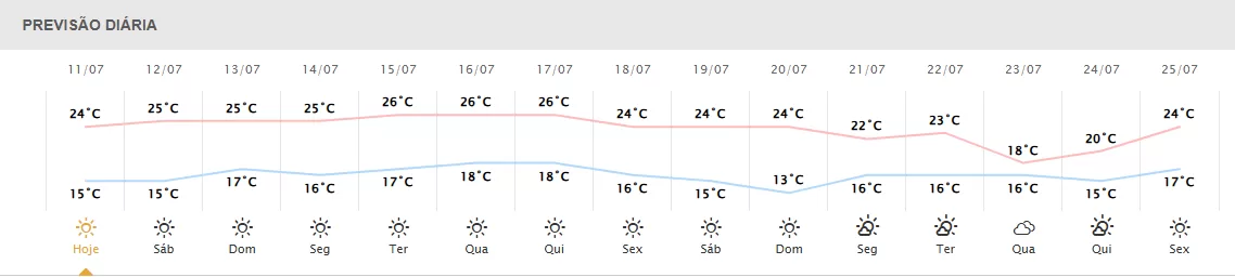 Foz do Iguaçu: mínima de 13°C, máxima de 23°C;