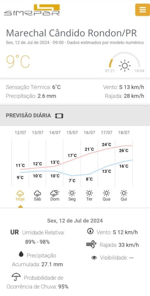 A instabilidade climática segue em Marechal Cândido Rondon nesta sexta-feira (12). De acordo com o Sistema de Tecnologia e Monitoramento Ambiental do Paraná (Simepar), o tempo permanece chuvoso e gelado para o final de semana.