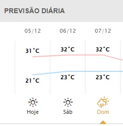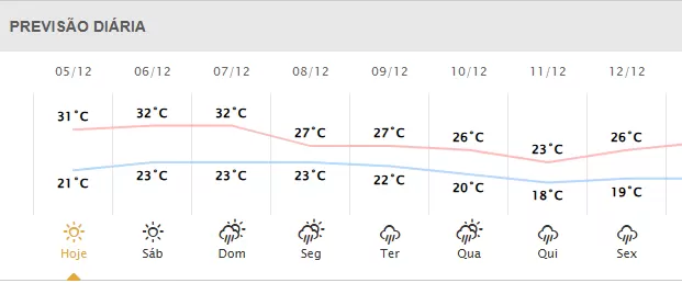No domingo, a condição de estabilidade atmosférica, com expectativa de que as temperaturas superem os 30°C em praticamente todo o estado. Há possibilidade de pancadas de chuva isoladas nas regiões Oeste e Norte.