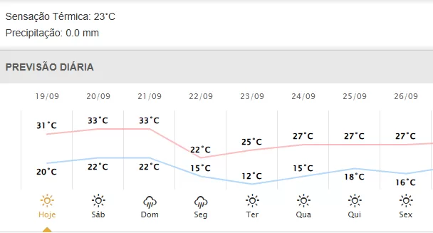 Final de semana promete ser quente no município. As temperaturas segundo o Simepar, marcam máxima de 33ºC. No domingo (21) tem possibilidade de 95% de chuva, um acumulo de 20,6 milímetros.