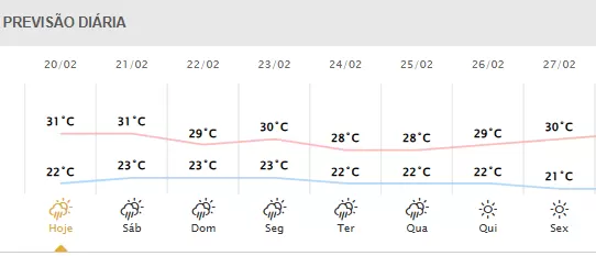 Segundo o Simepar, as temperaturas variam entre 22ºC e 31ºC, as rajadas de vento chegam a 34 km/h e a probabilidade de chuva é de 8,9 milímetros.