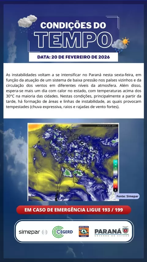 Segundo o Sistema de Tecnologia e Monitoramento Ambiental do Paraná (Simepar), as instabilidades voltam a se intensificar no Paraná nesta sexta-feira, em função da atuação de um sistema de baixa pressão nos países vizinhos e da circulação dos ventos em níveis baixos da atmosfera.