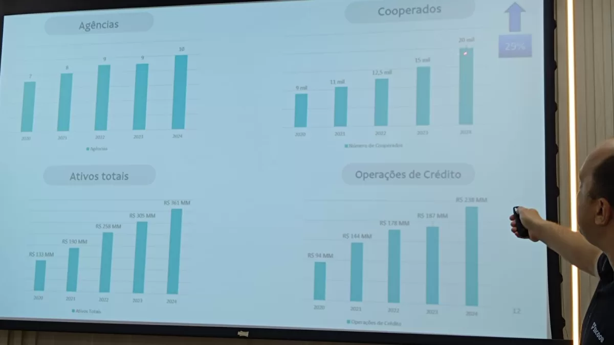 Hugo Ferraz, diretor do Sicoob, realizou uma breve apresentação sobre o crescimento expressivo da cooperativas nestas duas décadas e afirmou que o Sicoob Confiança mantém seu compromisso com o associado e que o crescimento tem sido de grande satisfação.