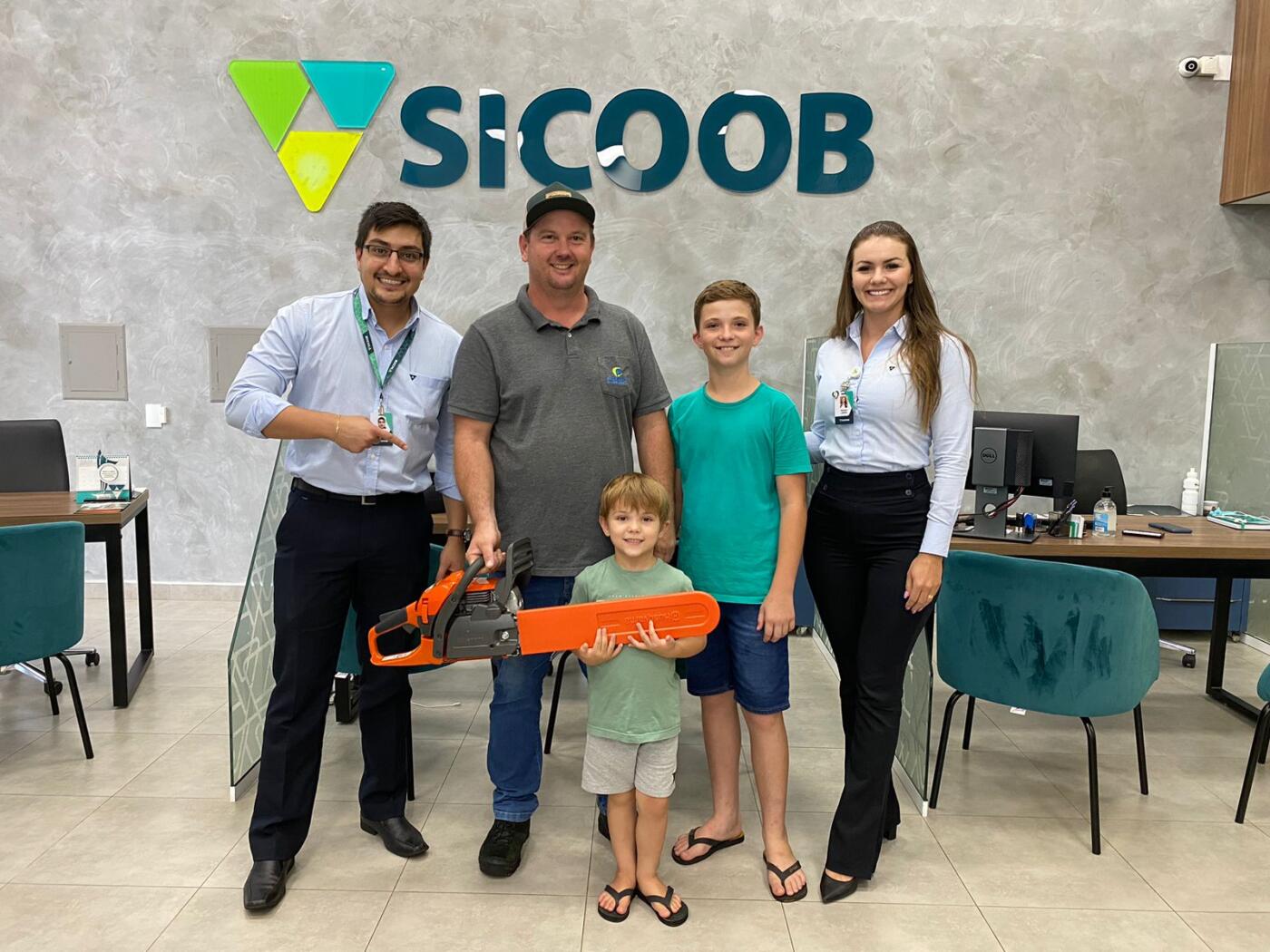 A entrega foi realizada na segunda-feira (30), pelo assessor de Mercado, Guilherme Trombetta, e pela supervisora administrativa da agência centro, Francieli Roehrs, ao felizardo Lucas Ivar Primo, ganhador da motosserra.