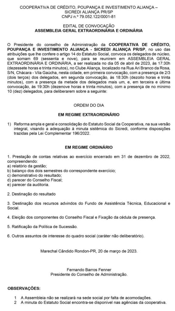 A Sicredi Aliança PR/SP promove, no dia 5 de abril, assembleia geral extraordinária e ordinária, às 17h30, no Clube Aliança, em Marechal Cândido Rondon, com a presença dos 69 delegados de núcleos, para reforma e consolidação do Estatuto Social da cooperativa visando à adequação à minuta sistêmica do Sicredi e prestação de contas relativas ao exercício encerrado em 31 de dezembro de 2022.